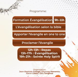 Pour ça le seigneur nous a mis à cœur d’organiser ces temps théoriques et pratiques, qui permettent à chacun d’apprendre les bases sur deux différents types d’évangélisation.